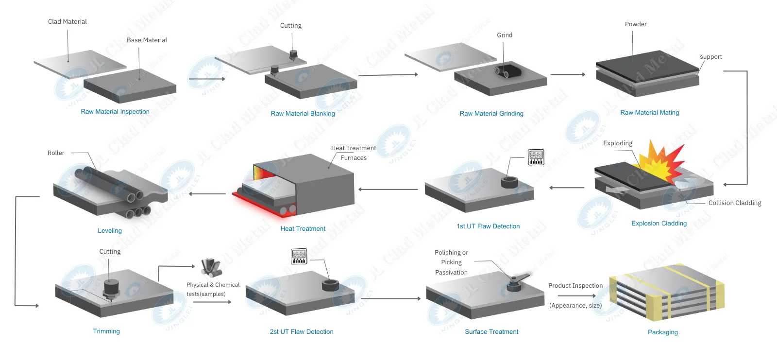 The company uses explosion welding technology to mass-produce various types of metal clad plates, including stainless steel-steel, nickel-based alloy-steel, titanium-steel, copper-steel, zirconium-steel, and tantalum-steel. All mechanical properties and physical-chemical performance indicators fully comply with current national standards and international advanced standards, with key performance indicators (such as shear strength and bonding rate) being industry-leading.